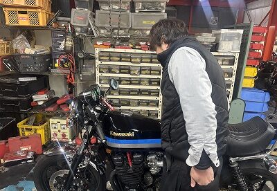 火曜日は、ジュンちゃんZ250FTで出社、翌、水曜日のツーリングの為はりきってました。(W3公道復帰ツーリング)あたしは、エンゼルセンパイの250SS(S1)のメーターO/Hの為メータやさんにレッツらGoo~(タクトのメーター作製の打ち合わせもかねて)ほしたら、会社から電話かかってきまして・・・DS400の修理ってやってもらえるか助けてくださいって電話かかって来ましたって言われたので、車検が通るような車両でしたら大丈夫ですYoo~ってジュンちゃんに言いましてエビスに戻りまして
