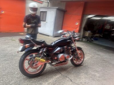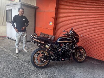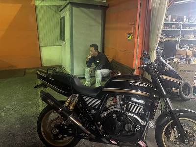 シャッター閉めて、重整備の段取りしてますと・・・平日だというのに、ソリコミパンチのA君、ZRX1100で登場!