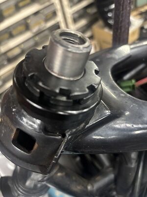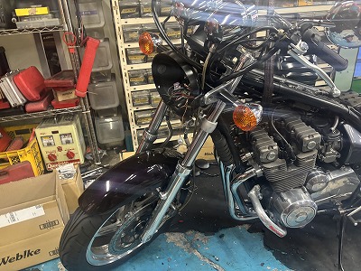 I君の嫁さんのゼファー400修理とカスタム承りましてF回りがおかしいとのことで、三又ステムベアリング交換案件で、ついでにフォークの油面もチェックしてほしいとのこと・・・なかなかの重整備になりました。