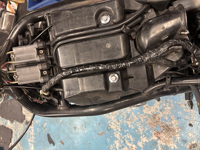 見える範囲の配線、なるべく純正ラインに引き直しまして・・・バッテリーの位置移設してあるのと、色々配線かえてあるので、正規の場所で引けない・・・汗