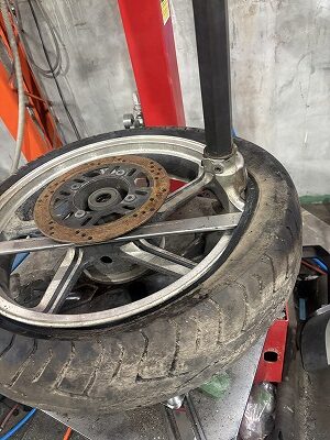 ほんでもって、リヤタイヤ外すのにカチカチでチェンジャーにくわえさせるのに、1時間ほど格闘! 当然バーナーでパイヤァ~しまくって触れんぐらい、あっためてやっとこさ、外す事できました。(この辺で、こころが、折れそう(´Д⊂グスンって思いながら、こんちくしょぉ~がぁ~ええぇ~かげん、くわえろやぁ~ってチェンジャ~に遊ばれリヤホイールにキレるおっさんであった爆)
